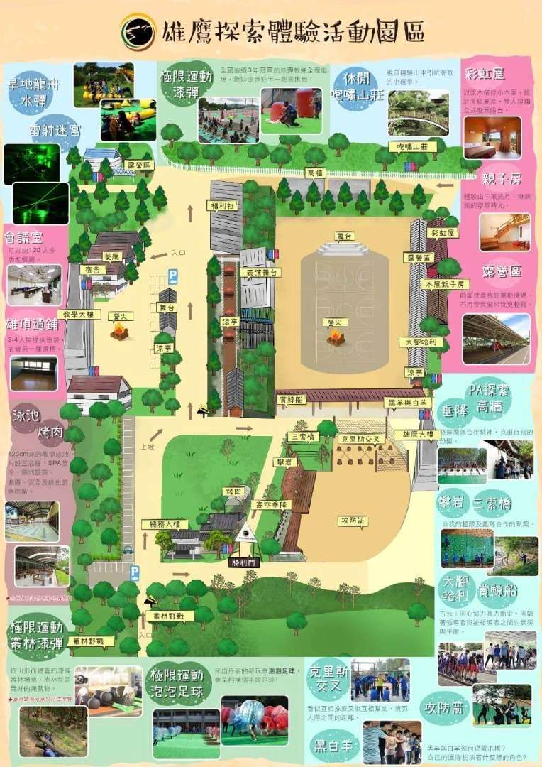 探索體驗區:風雨走廊/勝利門/三索/大腳哈利/克里斯交叉/垂降/高牆/黑白羊/賞鯨船/攀岩/露營場地/分享/其他